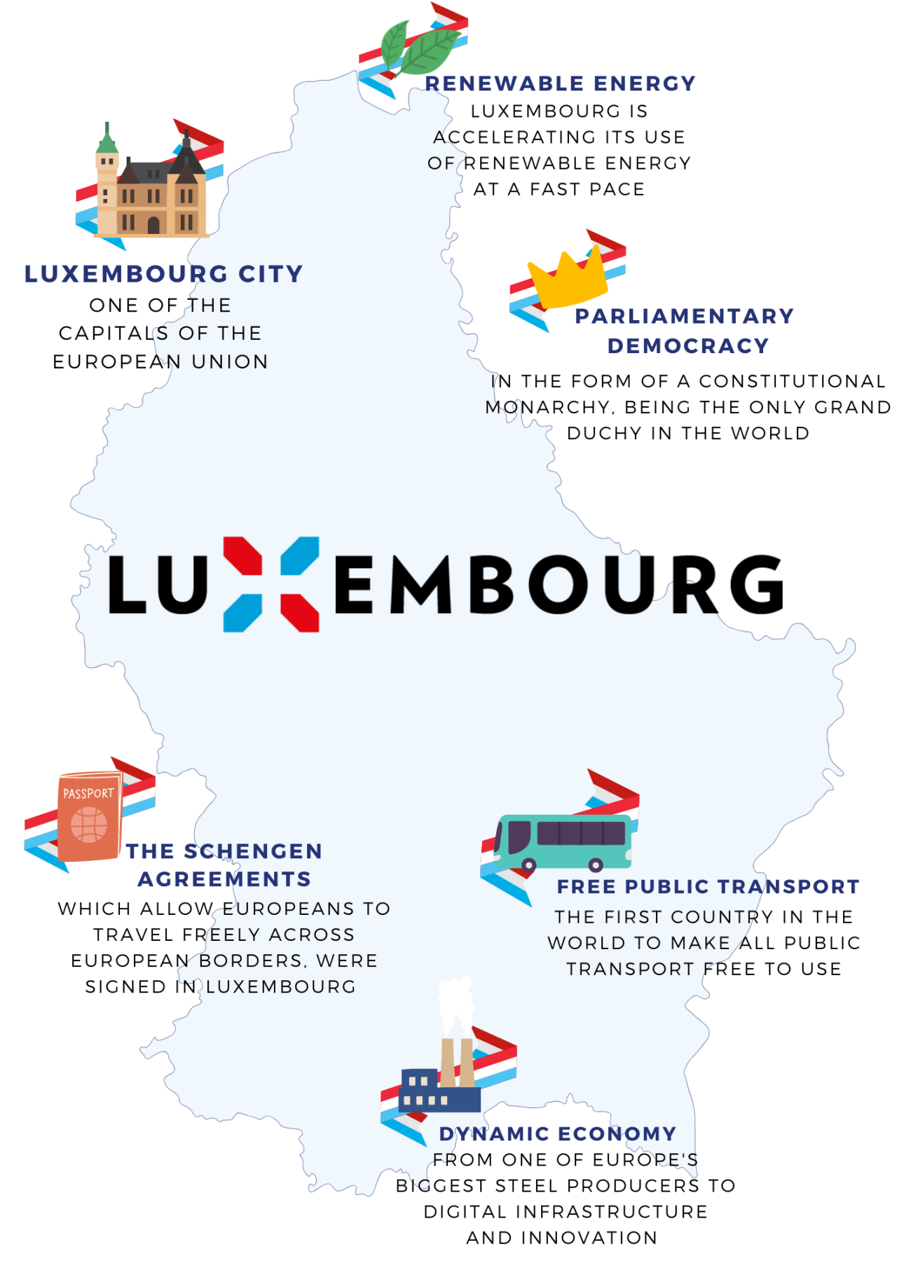 Les étrangers représentent près de la moitié de la population luxembourgeoise. Sa culture, sa population et ses langues sont étroitement liées à celles de ses voisins, ce qui en fait essentiellement un mélange de cultures française et allemande, comme en témoignent les trois langues officielles du pays : le français, l'allemand et le luxembourgeois. Démocratie représentative dotée d'une monarchie constitutionnelle, le Luxembourg est représenté par le Grand-Duc Henri et constitue le seul grand-duché souverain subsistant au monde.